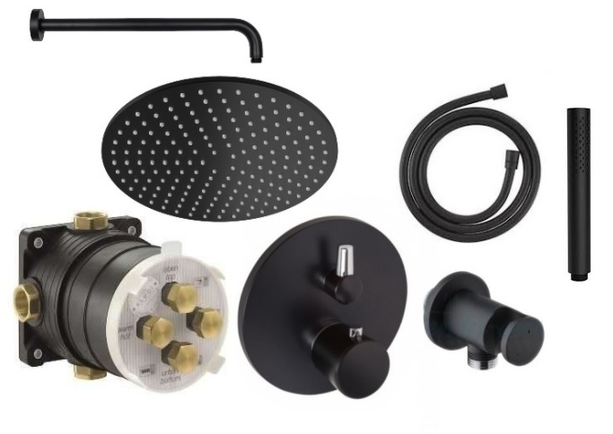 Mamy w ofercie kompletny podtynkowy zestaw Kludi Balance z baterią termostatyczną w wersji czarny mat. Zestaw składa się z podstawowych elementów firmy Kludi tj. element podtynkowy 88011 oraz podtynkowy termostat Balance 528303975 ( czarny mat ). Pozostałe elementy z kolei sa to produkty włoskich firm takich jak Sphera, Bossini czy też Paffoni jako iż skompletowanie jednorodnego zestawu składającego się tylko i wyłącznie z produktów Kludi jest niemożliwe. Tak więc deszczownica ( mosiężna 300mm ) wąż, słuchawka i przyłącze kątowe będa włoskich firm.